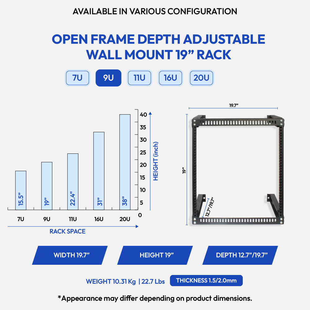 Open Frame Depth Adjustable Wall Mount 19" Rack -9U