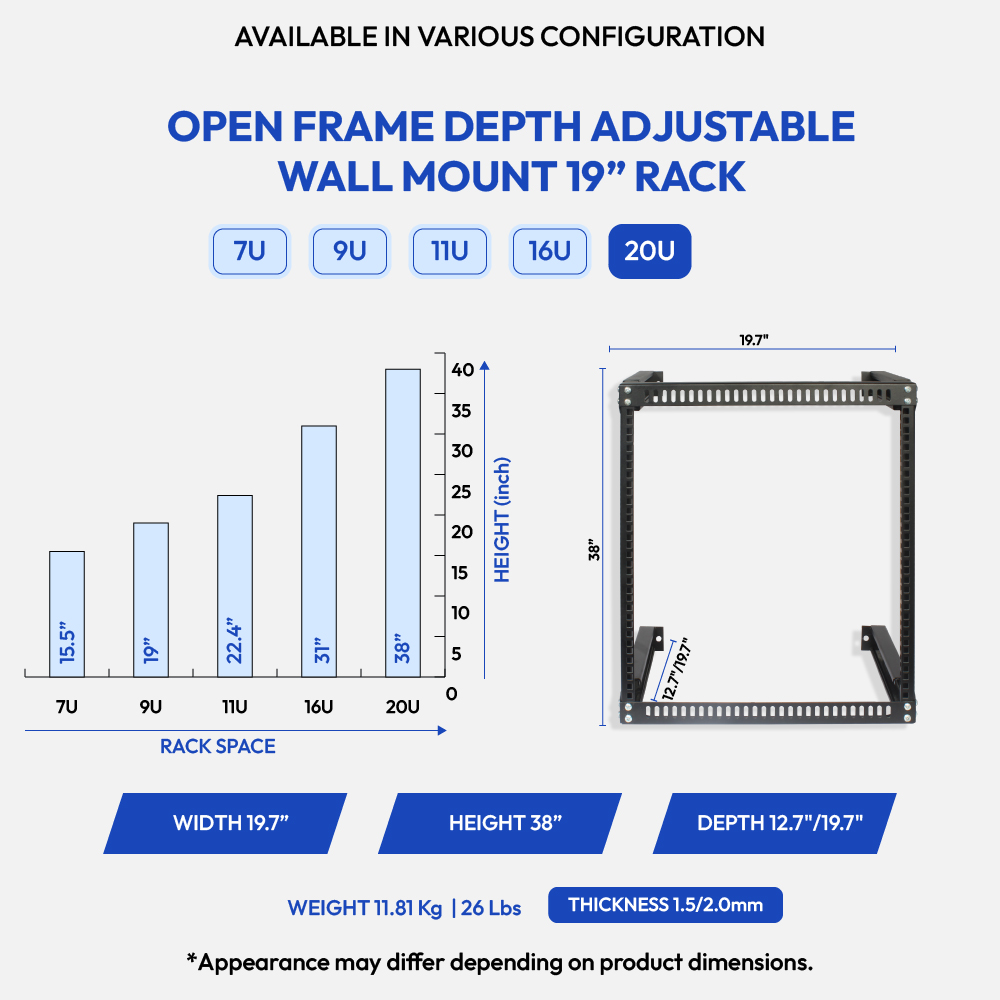 Open Open Frame Depth Adjustable Wall Mount 19" Rack -20U