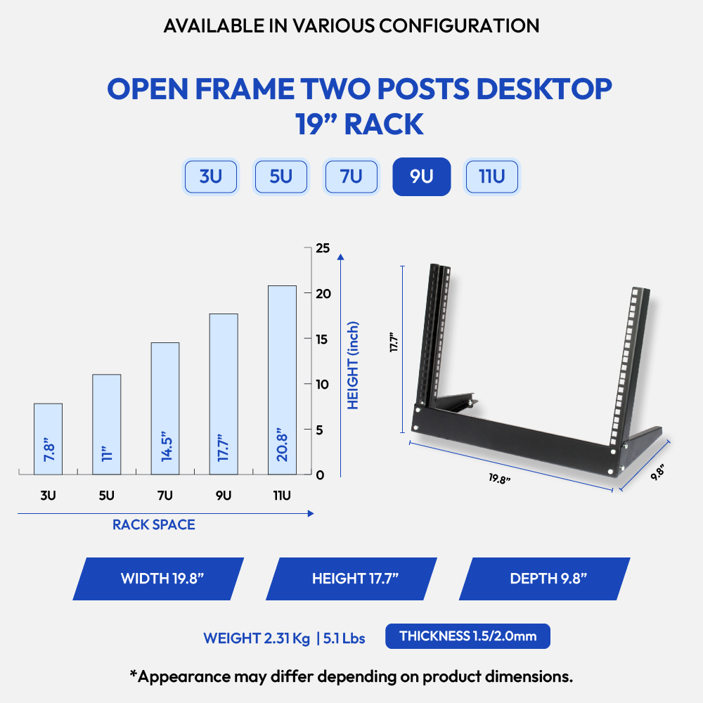 Open Frame Two Posts Desktop 19" Rack - 19ODTTP9U