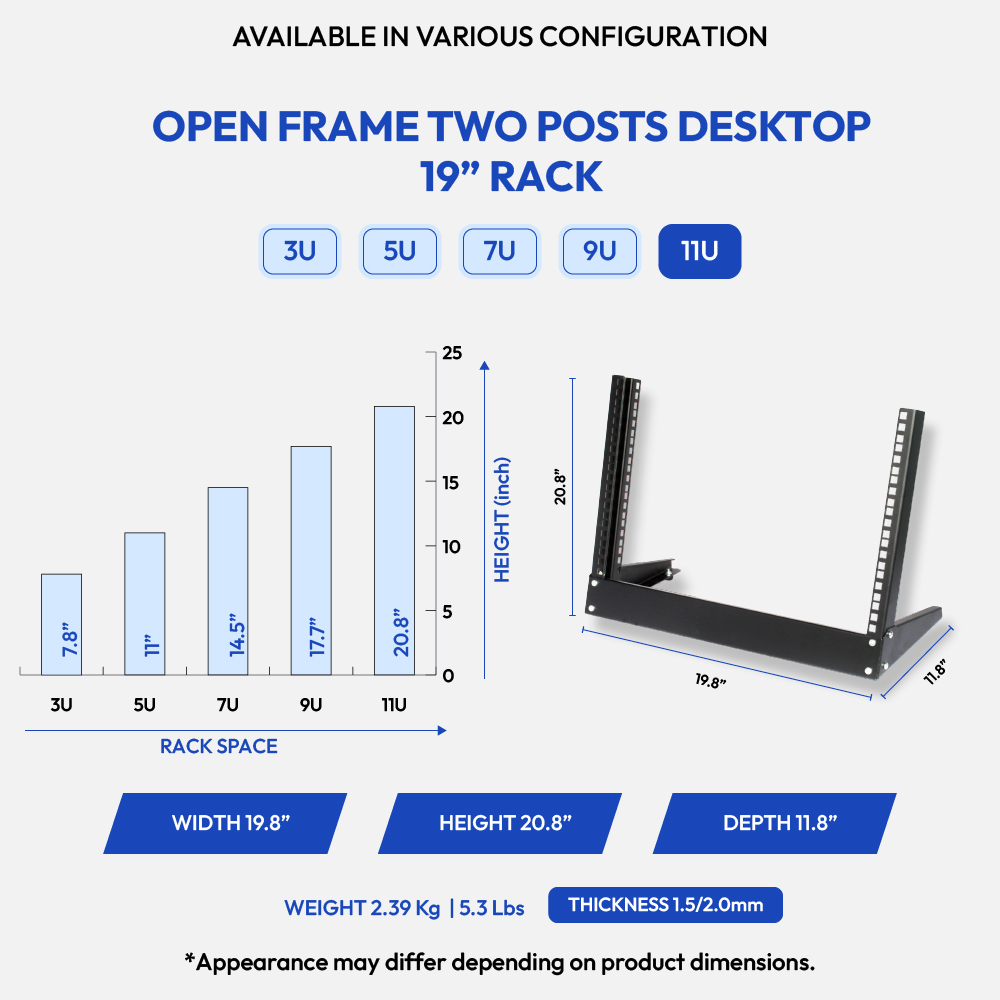 Open Frame Two Posts Desktop 19" Rack - 19ODTTP11U