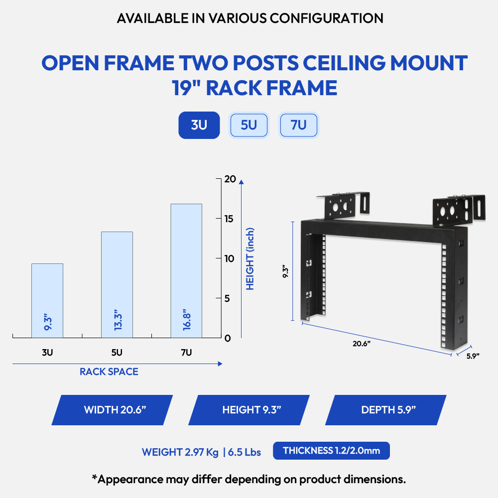Open Frame Two Posts Ceiling Mount 19" Rack Frame - 19OF2CM3