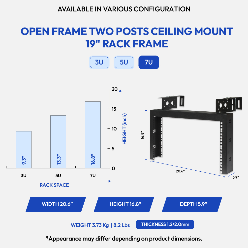 Open Frame Two Posts Ceiling Mount 19" Rack Frame - 19OF2CM7
