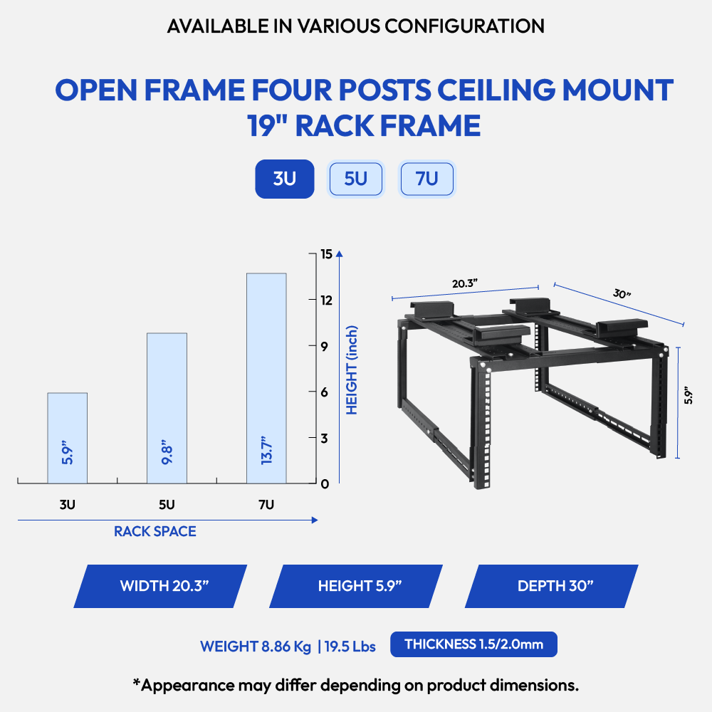 Open Frame Four Posts Ceiling Mount 19" Rack Frame - 19OF4CM3
