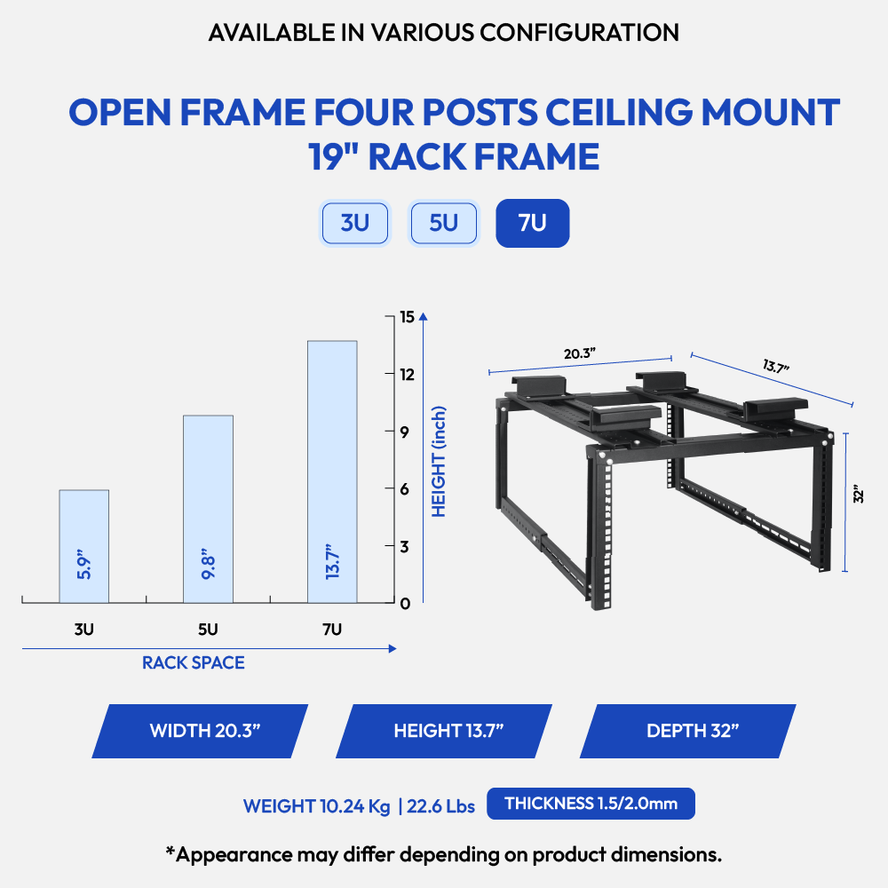 Open Frame Four Posts Ceiling Mount 19" Rack Frame - 19OF4CM7