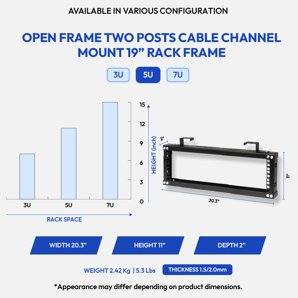 Open Frame Two Posts Cable Channel Mount 19" Rack Frame - 19OF2CCM5