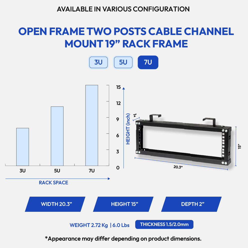 Open Frame Two Posts Cable Channel Mount 19" Rack Frame - 19OF2CCM7